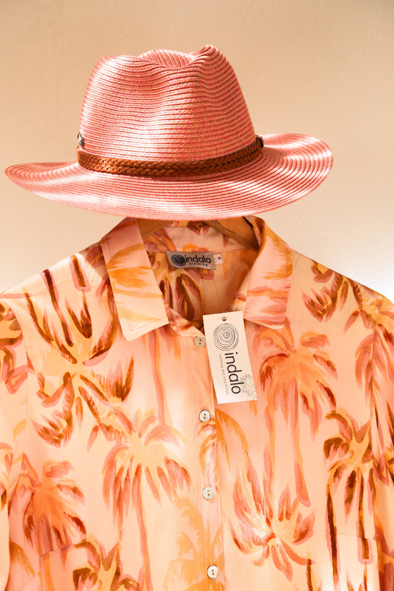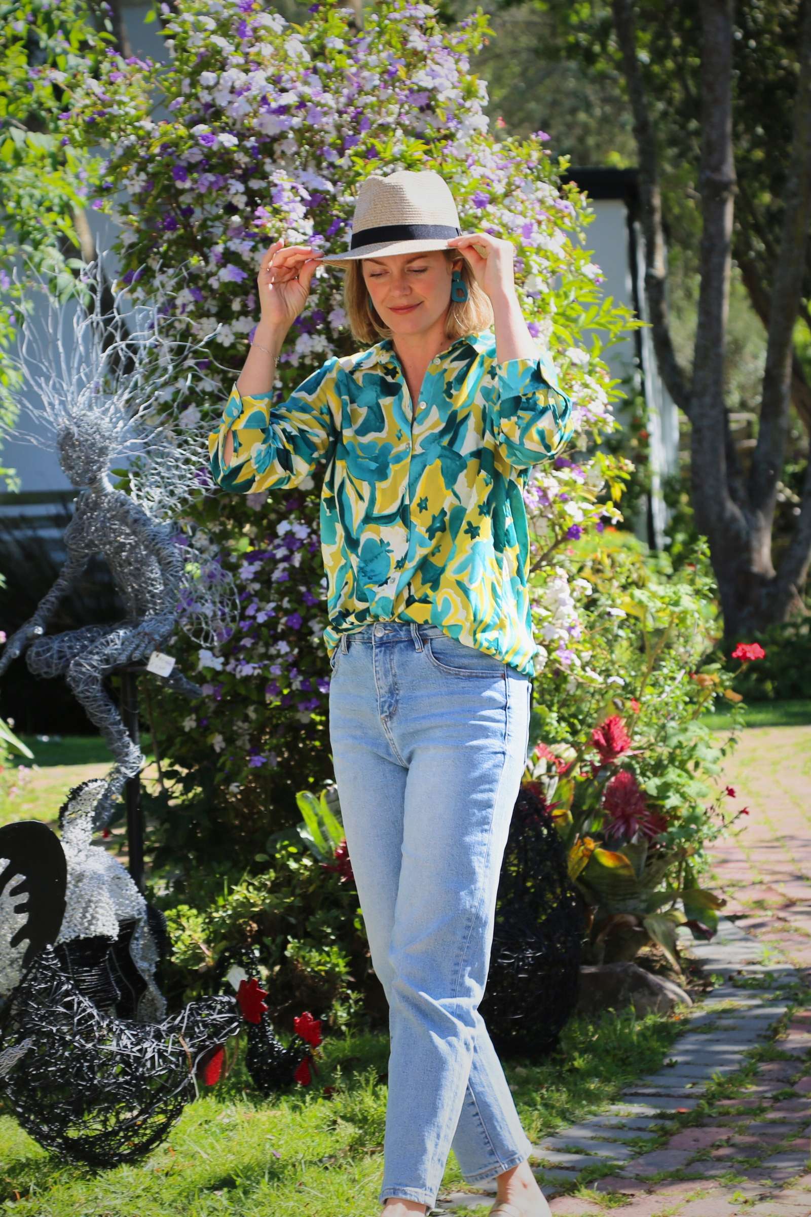 This is a timeless classic shirt, it’s a versatile staple for any wardrobe. It is a comfortable fit and features a crisp collar, button front, and cool fabric for all-day comfort. Dress it up with tailored trousers or keep it casual with jeans – it’s made for effortless styling, season after season. Choose between the beautiful palm print in softer colours for an island feel, a more classic look with the blue and white abstract or the vibrant chartreuse and teal.