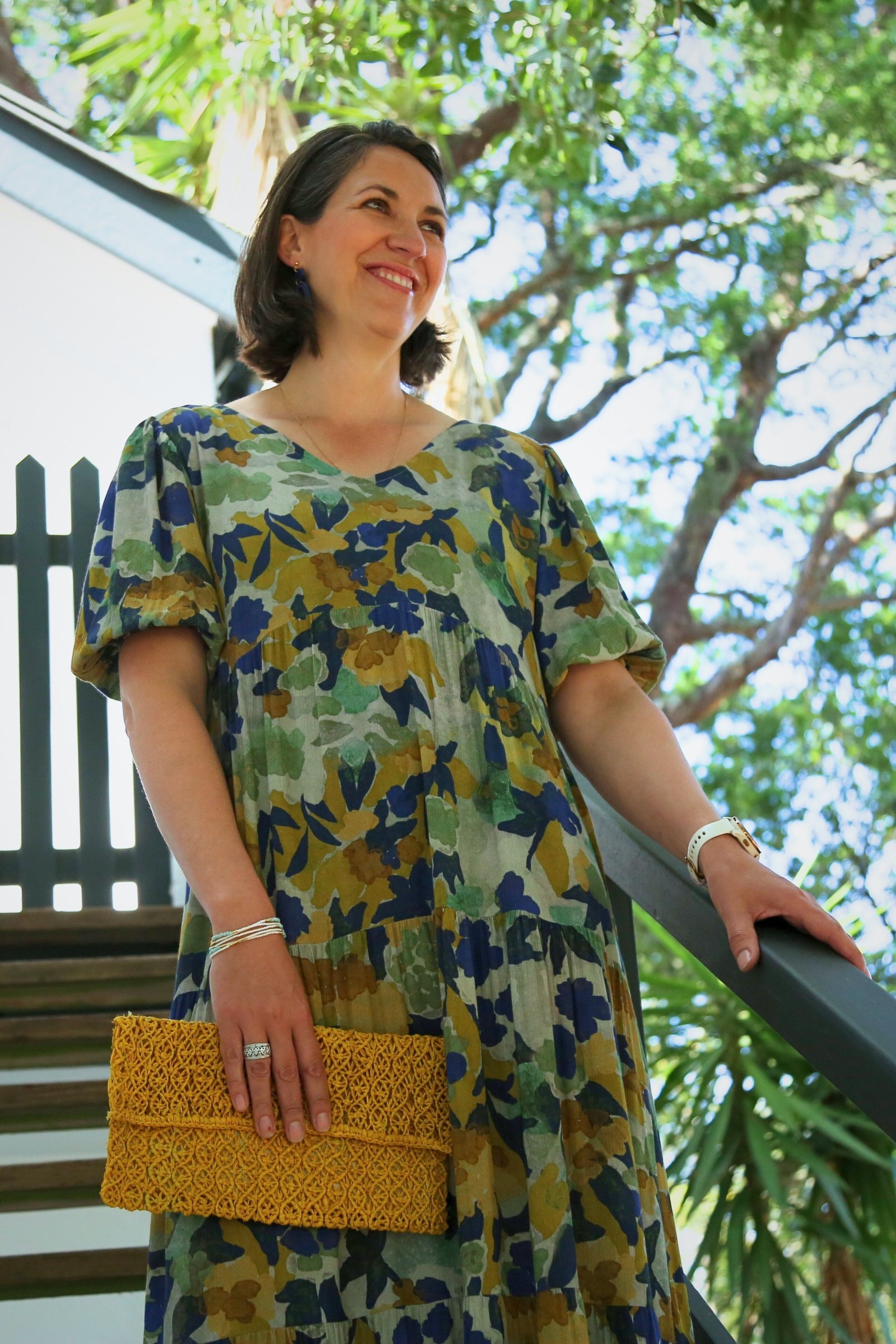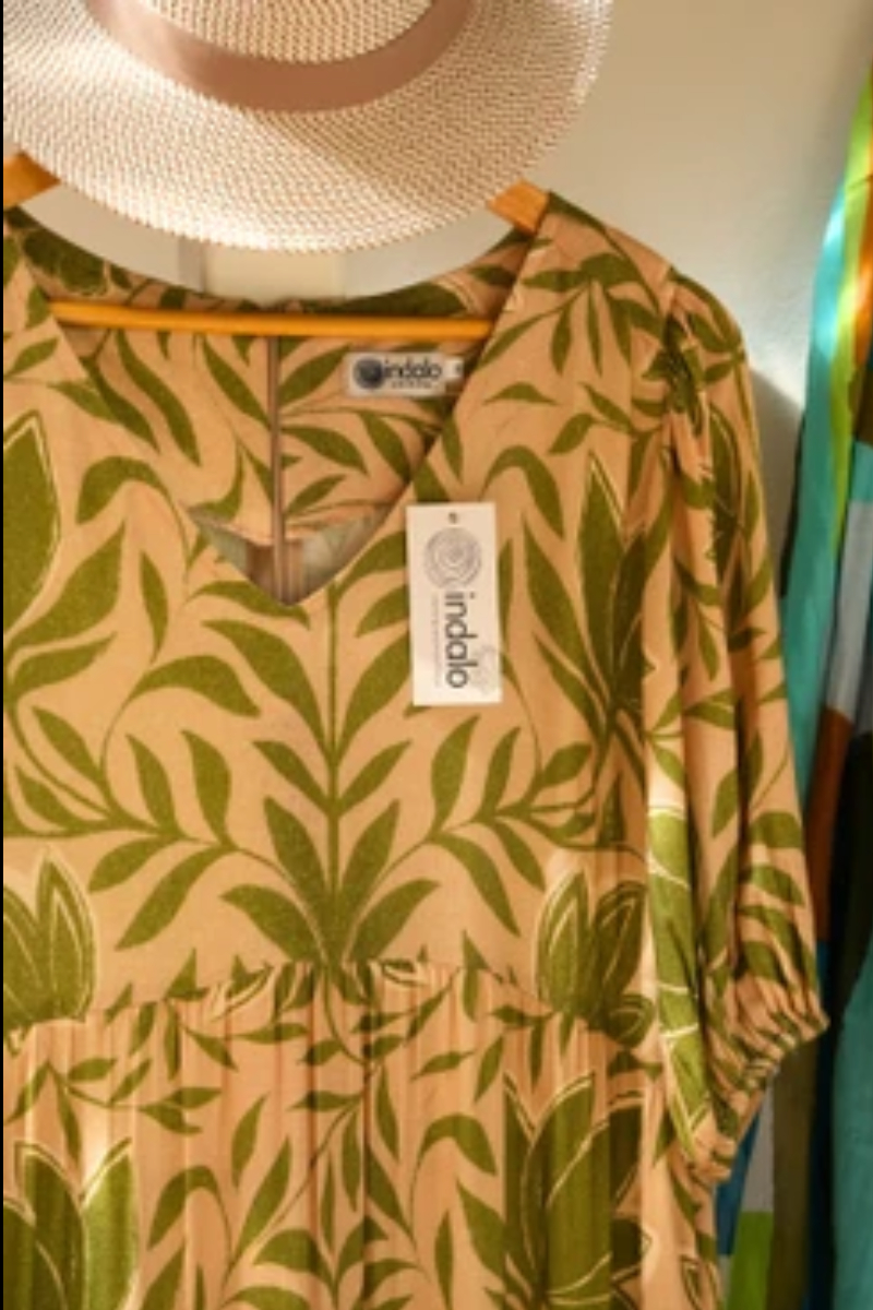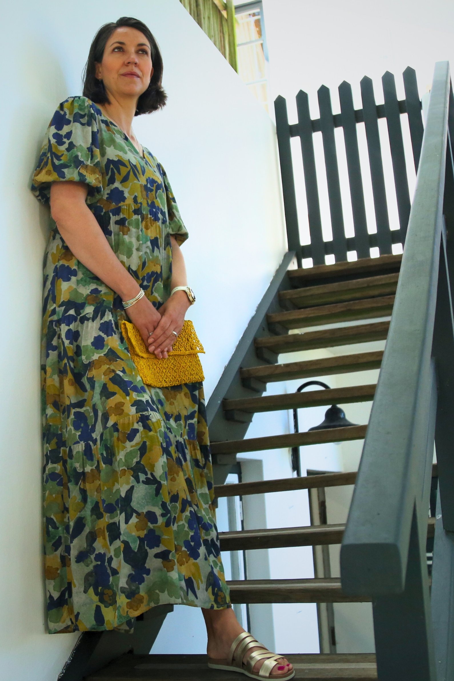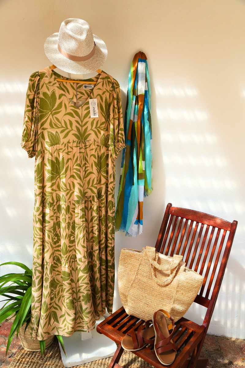Our full length tiered dress is designed to turn heads. Crafted from a beautiful  viscose, this floaty silhouette features a short, puff  sleeve, an invisible zip at the back and a charming V-neckline.  Lightweight and effortless, dress it up with heels for elevated weekend plans or down with a jacket and boots for a casual weekday outfit.